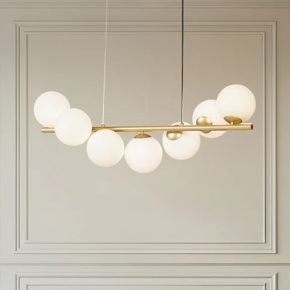 Harmonijnie wygięta lampa wisząca Isandro 7-punktowa lampa wisząca Isandro marki Lucande uosabia nowoczesny styl, który idealnie wkomponowuje się w atmosferę jadalni. Matowe złoto w połączeniu z kulami z opalowego szkła podkreśla elegancję projektu i sprawia, że lampa przyciąga wzrok. Nieprzezroczysty charakter każdej kuli rozprasza rozproszone, nieoślepiające światło, które idealnie nadaje się do ogólnego oświetlenia nad stołem w jadalni.