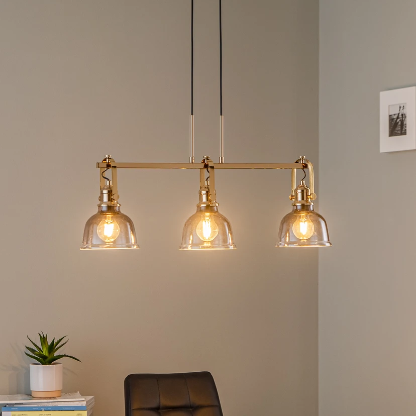 Lampa wisząca Mago łączy w sobie industrialny design z elegancką kolorystyką w kolorze złotym i dymnoszarym. Wykonana z wysokiej jakości metalu i szkła, ta 3-punktowa lampa stanowi imponujące połączenie solidności i estetyki. Jej wszechstronność przejawia się w możliwości ściemniania za pomocą zewnętrznego ściemniacza, dzięki czemu można indywidualnie dostosować intensywność światła. Funkcja ta pozwala na elastyczne dostosowanie oświetlenia w celu stworzenia różnych nastrojów, czy to w salonie, jadalni, czy w kuchni.