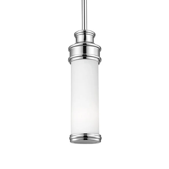 Wisząca lampa Payne LED z wytrawionym kloszem z opalowego szkła wyposażona jest w zabezpieczenie przed rozpryskami wody ze wszystkich stron i dlatego może być stosowana w pomieszczeniach, w których się zamoczy. Stylistycznie jest to nowa interpretacja eleganckiego stylu Tudora z toczonymi elementami metalowymi z polerowanym chromem.