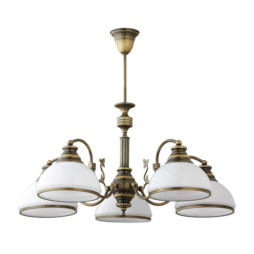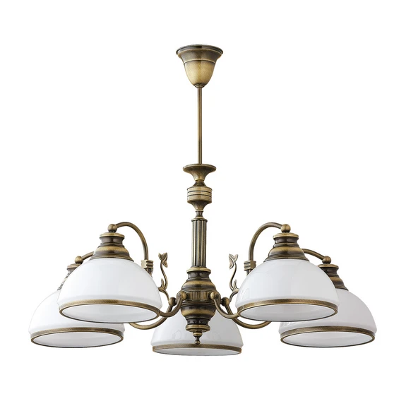 Lampa wisząca Petro z pięcioma szklanymi kloszami łączy w sobie antyczny urok z nowoczesną funkcjonalnością. Wykonana z wysokiej jakości metalu i szkła, lśni eleganckim wykończeniem w kolorze starego mosiądzu, nadając każdemu pomieszczeniu ponadczasową elegancję. Lampa idealnie nadaje się do salonu i jadalni, gdzie dzięki stylowemu wzornictwu i harmonijnej kolorystyce tworzy ciepłą i przytulną atmosferę.