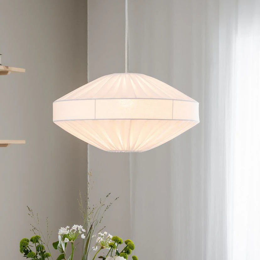 Biała bawełniana lampa wisząca Edith Lampa wisząca Edith to nowoczesny skandynawski model "UFO" wykonany z bawełnianej tkaniny Franza, która tworzy miękkie i równomierne światło ze względu na charakter klosza. Klosz jest wykonany ręcznie w UE, a lampa Edith jest dostarczana z kablem przyłączeniowym o długości 120 cm i rozetą w kolorze białym. Tkanina jest certyfikowana zgodnie ze standardem 100 przez OEKO-TEX®. Certyfikat ten gwarantuje, że produkt został przetestowany i jest wolny od substancji, które mogą być szkodliwe dla zdrowia i środowiska