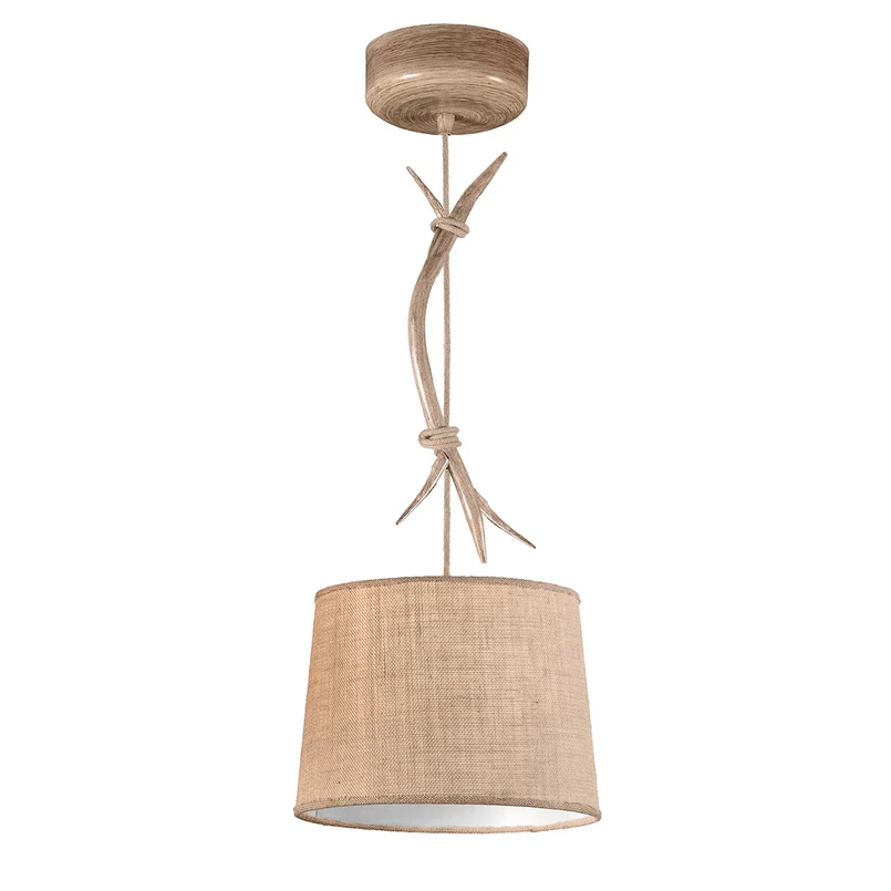 Przyjazna i bliska naturze: mała lampa wisząca Sabina o rustykalnym designie Lampa wisząca Sabina jest przyjazna i dostępna w jasnych kolorach. Die design charakteryzuje się gałęzią, która jest przymocowana do środka zawieszenia kablowego. Jest ona wykonana z wytrzymałego metalu i pomalowana na kolor drewnopodobny, co nadaje jej zwodniczo realistyczny wygląd. Klosz w beżowym kolorze wykonany z wysokiej jakości tkaniny podkreśla naturalny wygląd lampy. Zawieszenie - tekstylny kabel w kolorze beżowym - również doskonale komponuje się z wyglądem lampy. Dzięki temu lampa wisząca Sabina nadaje się szczególnie do wnętrz w stylu rustykalnym, ale jej jasna, harmonijna kolorystyka może również tworzyć kontrast w nowoczesnych wnętrzach.
