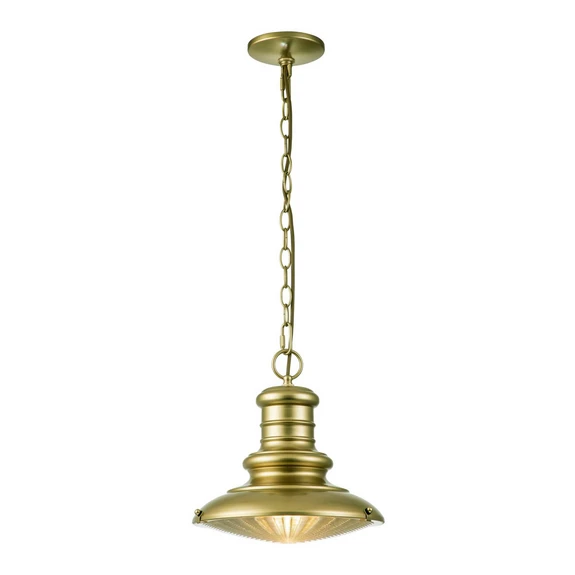 Zewnętrzna lampa wisząca Redding Station w kolorze mosiądzu Wykonana z aluminium z wykończeniem w kolorze antycznego mosiądzu i szkła, lampa wisząca Redding Station jest dekoracyjnym źródłem światła dla wielu obszarów zewnętrznych. Dyfuzor wykonany z pryzmatycznego szkła znajduje się w szerokim, płaskim kloszu, zapewniając skuteczne rozproszenie światła.