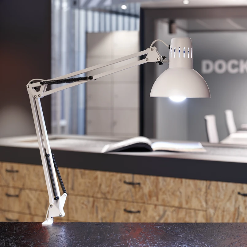 Lampa z klipsem MAULstudy - klasyk designu wśród lamp z klipsem Skuteczne oświetlenie wszędzie tam, gdzie jest potrzebne. Lampa z klipsem MAULstudy jest wyposażona w zacisk stołowy i może być montowana na blatach lub półkach w zakresie od 0 cm do 5,5 cm. MAULstudy można elastycznie przesuwać we wszystkich kierunkach dzięki możliwości obracania i pochylania głowicy i ramienia. MAULstudy umożliwia precyzyjną pracę dzięki indywidualnie regulowanym warunkom oświetlenia. Idealny również do użytku profesjonalnego. Źródło światła nie wchodzi w zakres dostawy - Możliwość elastycznej regulacji we wszystkich kierunkach - Idealna żarówka do użytku prywatnego i profesjonalnego - Włącznik/wyłącznik wbudowany w przewód zasilający