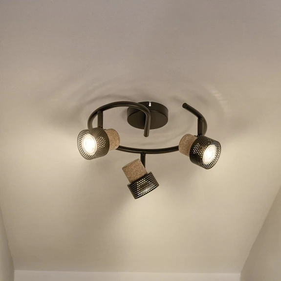 3-punktowy reflektor sufitowy LED Cork w kształcie spirali ze źródłami światła GU10, ściemniany Reflektor sufitowy LED Cork w kształcie spirali prezentuje się w pięknym połączeniu materiałów. Podczas gdy rama wraz z rozetą i perforowanymi kloszami wykonana jest ze stali o matowym wykończeniu, tylne części reflektora pokryte są korkiem. Oprawa jest dostarczana ze ściemnianymi lampami LED GU10, a reflektory można zarówno obracać, jak i odchylać. Idealnie nadaje się do zastosowań wewnętrznych, na przykład w korytarzach i holach, strefach wejściowych, salonach, kuchniach i wielu innych - wszechstronna, konfigurowalna i trwała dzięki wymiennym żarówkom LED - wysokiej jakości obudowa z matowym wykończeniem - ściemniane żarówki LED w zestawie - łatwa instalacja - w zestawie kompletne akcesoria montażowe i przyłączeniowe