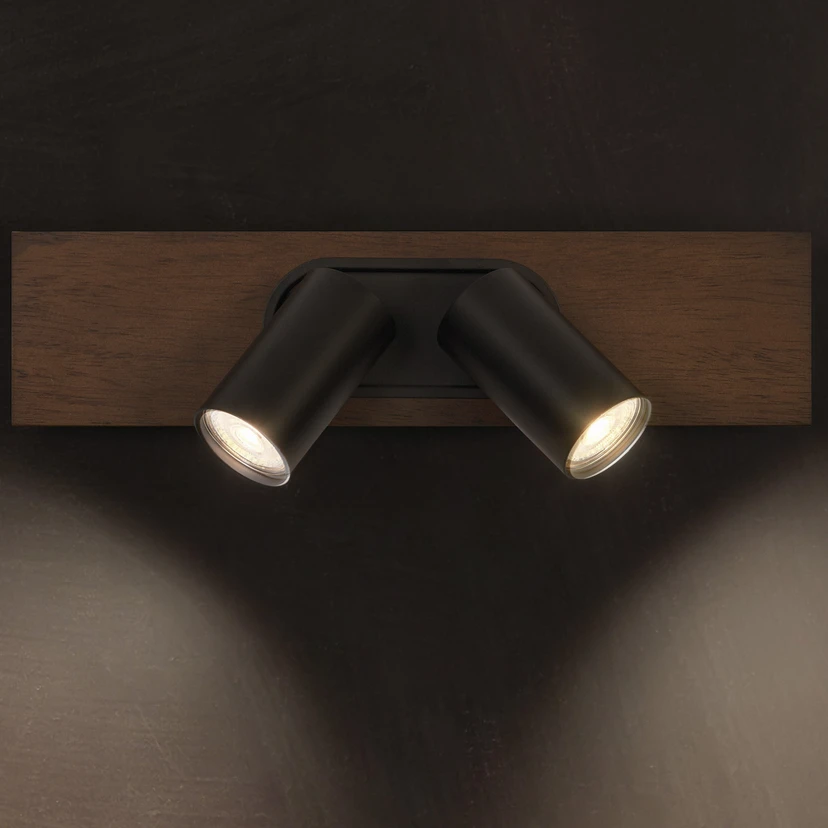 Reflektor sufitowy LED Mercury, 2-punktowy z żarówkami LED GU10 2-punktowy reflektor sufitowy LED Mercury wyróżnia się pięknym połączeniem materiałów i prostym designem. Prostokątna rozeta, która podobnie jak dwa reflektory jest wykonana z lakierowanej stali, ma nieco większy panel dekoracyjny z ciemnego drewna. Dwa umieszczone pośrodku spoty mają wysokiej jakości wygląd i są regulowane, dzięki czemu światło można skierować na dwa różne obszary pomieszczenia. Dostarczone ściemniane źródła światła GU10 LED są wymienne - Nadaje się do montażu sufitowego i ściennego - W zestawie kompletne akcesoria montażowe i połączeniowe