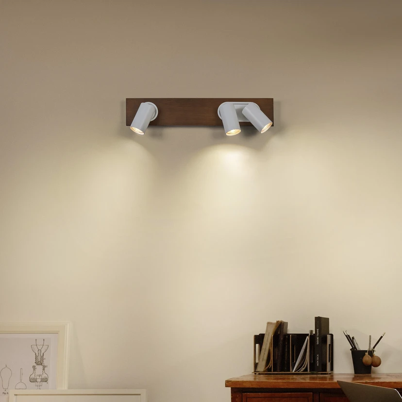 Reflektor sufitowy LED Mercury, 3-punktowy, ze źródłami światła LED GU10 3-punktowy reflektor sufitowy LED Mercury wyróżnia się pięknym połączeniem materiałów i kolorów oraz prostym designem. Prostokątna rozeta, która podobnie jak trzy spoty jest wykonana z lakierowanej stali, ma nieco większy panel dekoracyjny z ciemnego drewna, na którym nierównomiernie rozmieszczono trzy spoty. Można je regulować, aby zapewnić ukierunkowane oświetlenie różnych obszarów pomieszczenia. Dostarczone ściemniane żarówki GU10 LED są wymienne - W zestawie kompletne akcesoria montażowe i przyłączeniowe