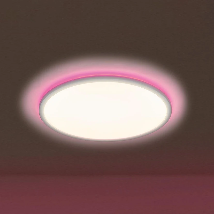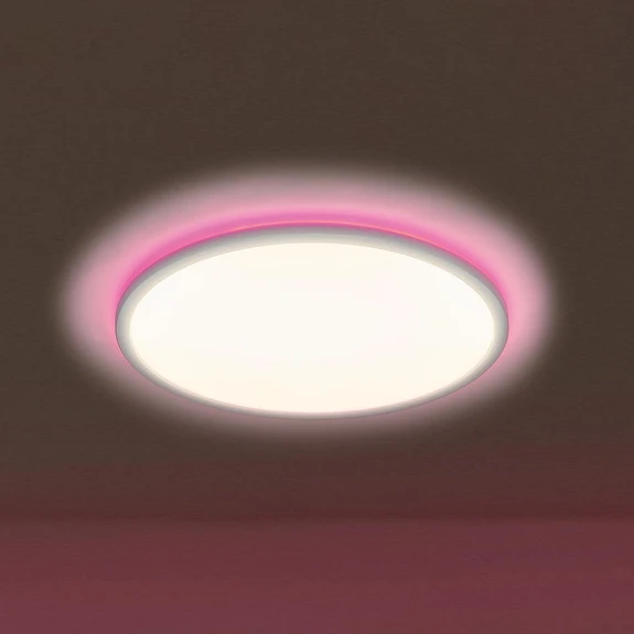Oprawa sufitowa LED Orbis Ultra Slim Backlight z tworzywa sztucznego składa się z wąskiej, okrągłej ramki i płaskiego, opalowego dyfuzora. Oprócz świecących w dół diod LED, z tyłu zintegrowane są kolejne diody. Oba źródła światła mogą być sterowane oddzielnie. Można na przykład uzyskać efektywne oświetlenie pomieszczenia w barwie światła od ciepłej bieli do dziennej bieli z kolorowym podświetleniem sufitu. Jasność, barwę światła i temperaturę barwową można regulować za pomocą aplikacji na tablecie/smartfonie lub za pomocą komendy głosowej. Lampa sufitowa jest zintegrowana z technologią LEDVANCE SMART WiFi poprzez sieć WLAN.