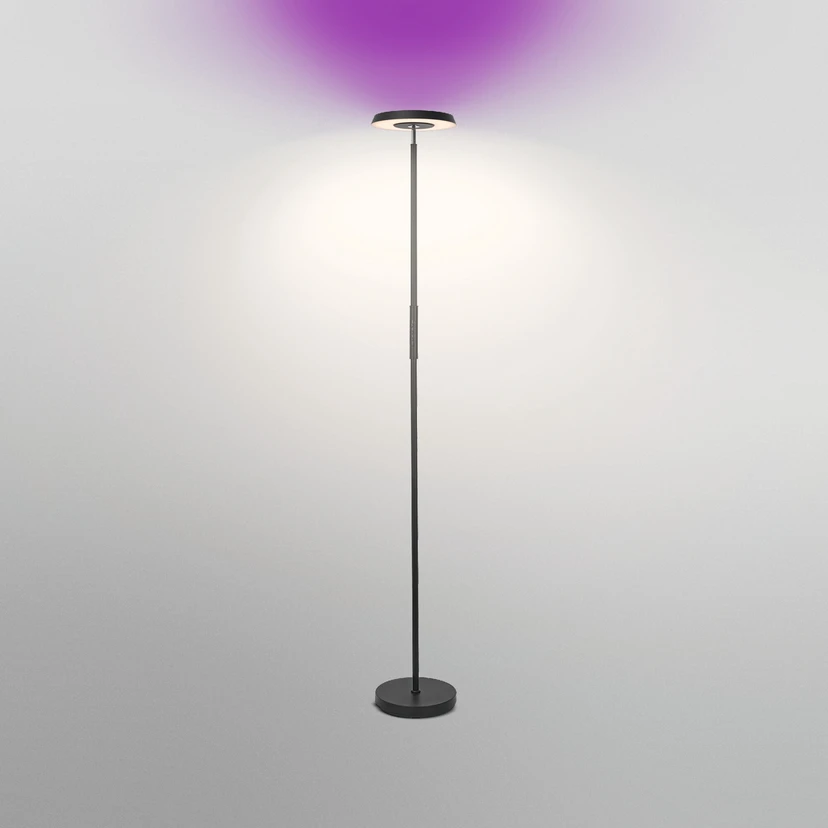 Nowocześnie zaprojektowana lampa podłogowa LEDVANCE SMART LED ze światłem świecącym z góry i z dołuTa lampa podłogowa LED idealnie nadaje się do klasycznego oświetlenia do czytania w salonie, ale także do tworzenia nastrojowej atmosfery w zastosowaniach związanych z domową rozrywką. Płaski, okrągły klosz jest wyposażony od spodu w diody LED o barwie od ciepłej bieli do uniwersalnej bieli, a także posiada dodatkowe źródło światła na górze, które zapewnia kolorowe, nastrojowe oświetlenie sufitu. Barwę światła można przełączać, ściemniać i kontrolować za pomocą powierzchni sterującej bezpośrednio na ramie lampy podłogowej LED lub przez sieć WLAN za pomocą aplikacji lub polecenia głosowego.Dane techniczne / kompatybilność:- możliwość sterowania za pomocą aplikacji LEDVANCE SMART WiFi (dostępnej bezpłatnie dla systemów iOS i Android); umożliwia ustawienia wstępne i automatyzację- możliwość sterowania za pomocą powierzchni sterującej na ramie lampy- możliwość sterowania głosowego za pomocą Asystenta Google lub Amazon Alexa- RGB (uplight) i ciepłe białe do uniwersalnej bieli (downlight)- możliwość ściemniania- protokół sieciowy: WiFi