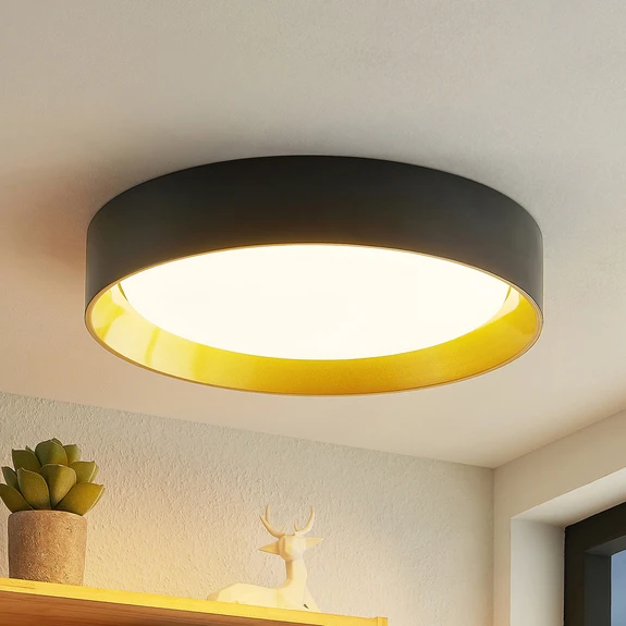 Kambia to piękna lampa sufitowa LED, która posiada rozłożysty abażur w kształcie płaskiego cylindra. Wykonany z aluminium klosz został ozdobiony czarnym wykończeniem na zewnątrz i złotym wewnątrz. Nadaje to lampie efektowny i wartościowy charakter.