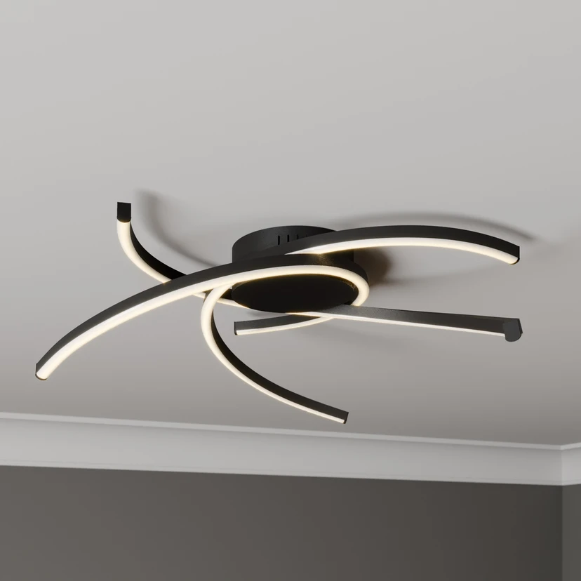 Katris wytwarza jasne światło i jest lampą sufitową, która szczególnie dobrze odnajdzie się w nowocześnie urządzonych mieszkaniach. Powierzchnia trzech łukowych elementów oświetleniowych jest matowo czarna, a wysoka jasność wydajnych diod LED może być ściemniana w trzech stopniach, jeśli używany jest zwykły przełącznik ścienny. Lampa może być instalowana we wszelkiego rodzaju pomieszczeniach mieszkalnych i zapewnia niezawodne światło w każdym miejscu.