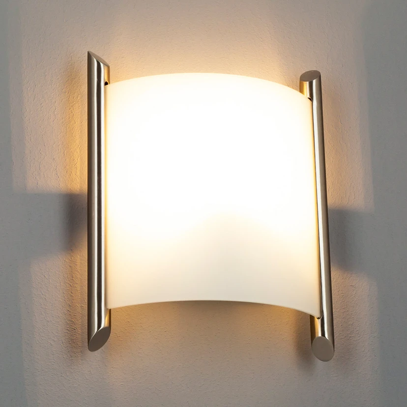 Kątowy kinkiet Filippa ze szkła i metalu Ten kinkiet ma bardzo atrakcyjny wygląd, szklany klosz jest lekko zakrzywiony i uzupełniony z boku dwoma metalowymi elementami z matowym niklowym wykończeniem. Po zamontowaniu na ścianie Filippa wygląda więc bardzo elegancko i naturalnie nowocześnie. Satynowana szklana wstawka tworzy miękki i ciepły rozsył światła, przy czym nie ma praktycznie żadnych ograniczeń w wyborze źródła światła, ponieważ oprawa E27 umożliwia stosowanie zarówno lamp żarowych i halogenowych, jak i bardziej wydajnych energooszczędnych i LED-owych źródeł światła.