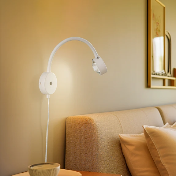 Kinkiet Jyla z elastycznym ramieniem i zintegrowaną funkcją ściemnianą Kinkiet Jyla jest wyposażony we wtyczkę, dzięki czemu można go elastycznie ustawiać w pomieszczeniach mieszkalnych. Do jej obsługi wystarczy jedynie gniazdko elektryczne w pobliżu. Zintegrowane elastyczne ramię jest szczególnie praktyczne, umożliwiając błyskawiczne dostosowanie kierunku uniwersalnego białego światła do osobistych wymagań. Jyla idealnie nadaje się jako źródło światła do biura, salonu lub sypialni. Dzięki nowoczesnej białej kolorystyce lampa ścienna z łatwością wkomponuje się w wiele różnych środowisk, a zintegrowany przełącznik na uchwycie ściennym umożliwia włączanie i wyłączanie światła w zwykły sposób. Dzięki technologii 3-stopniowego ściemniania ze zintegrowaną funkcją wyłączania, można go również ściemniać do trzech różnych poziomów jasności poprzez kilkukrotne naciśnięcie przełącznika: 100%, 50% i 25%. Dostarczone źródło światła GX53 ma zakrzywioną soczewkę, dzięki czemu wygląda jak szklana półkula.