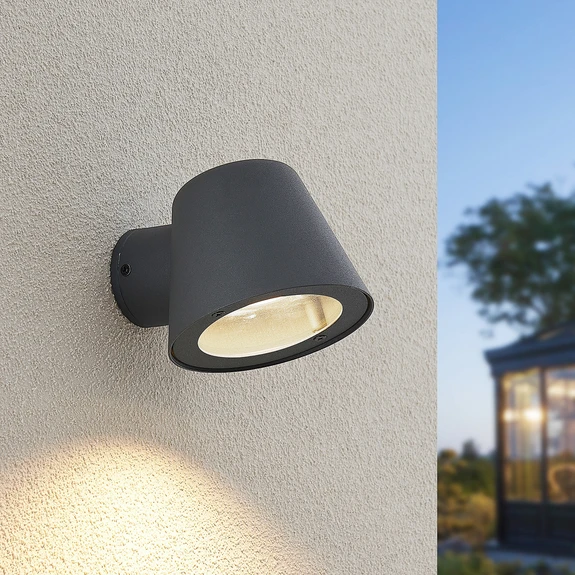 Stylowa zewnętrzna lampa ścienna Ileyna w kolorze ciemnoszarym Zewnętrzna lampa ścienna Ileyna zachwyca dyskretnym wyglądem i subtelną kolorystyką. Składa się z klosza w kształcie stożka, do którego można włożyć źródło światła GU10. Wykonany jest z wytrzymałego aluminium i wykończony w kolorze ciemnoszarym, co nadaje mu gładki i elegancki wygląd. Dzięki stopniowi ochrony IP44 jest chroniona przed bryzgami wody i dlatego idealnie nadaje się do użytku na zewnątrz. Dzięki stylowemu wzornictwu robi świetne wrażenie na patio, nie naruszając przy tym stylu architektonicznego domu. Kompaktowy rozmiar kinkietu zewnętrznego Ileyna sprawia, że zajmuje on więcej miejsca niż nieporęczne lampy ścienne, dzięki czemu nie zabiera zbyt wiele przestrzeni. W razie potrzeby można go również połączyć z innymi lampami z serii, aby stworzyć harmonijny wygląd.