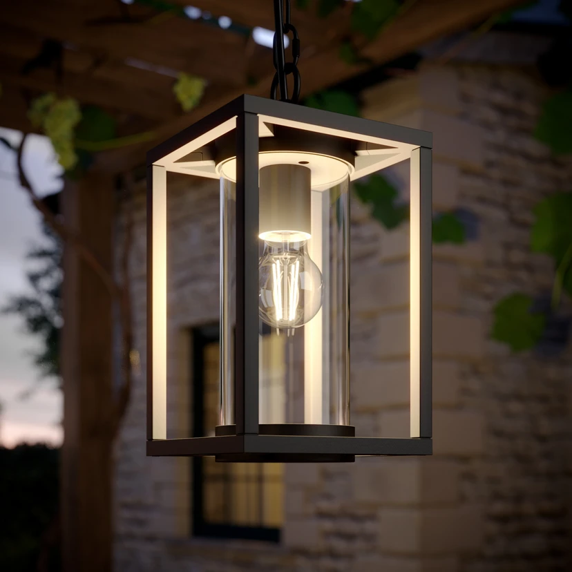 Ferda - lampa wisząca na zewnątrz Nowoczesna lampa wisząca zewnętrzna Ferda jest wykonana z aluminium w kolorze antracytowym. Światło pochodzi tu z żarówki E27, którą można dowolnie wybrać. Jest ona chroniona ze wszystkich stron przez przezroczysty szklany cylinder, który zapewnia, że wiatr i pogoda nie zaszkodzą technologii wewnątrz, a także emituje światło równomiernie do otoczenia. Zewnętrzna lampa wisząca emituje przyjemne, ciepłe, białe światło, które tworzy przytulną atmosferę. Niezależnie od tego, czy są to tarasy, werandy czy inne zadaszone obszary zewnętrzne, wszystkie one mogą skorzystać z lampy wiszącej zewnętrznej Ferda.