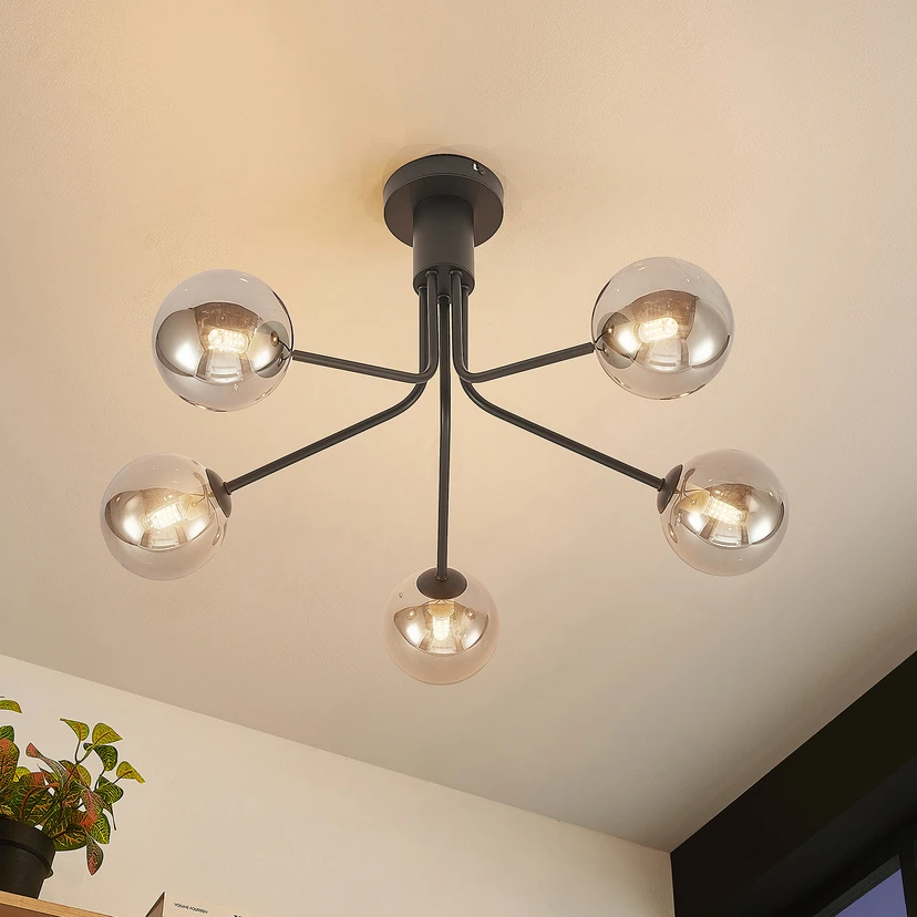 Elegancki wygląd przydymionego szkła w przestrzeni mieszkalnej: pięciolampowa lampa sufitowa Wynona w kolorze czarnym