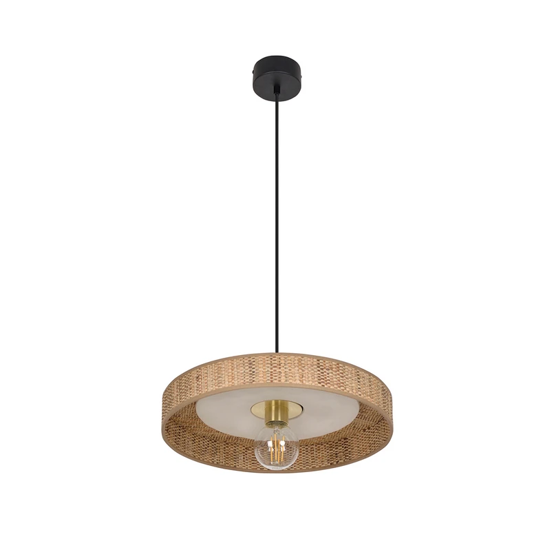Jednopłomienna lampa wisząca Portinatx z kloszem z naturalnego włókna i ceramiki Okrągły klosz lampy wiszącej Portinatx jest wykonany z naturalnego brązowego splotu z włókna banafibre. Do tego dochodzi ceramiczny krążek i skierowane w dół gniazdo z mosiężnym wykończeniem. Czarne zawieszenie składa się z okrągłej metalowej czaszy i kabla w tekstylnej osłonie. Lampa wisząca Portinatx może być idealnie wyposażona w dekoracyjny żarnik.