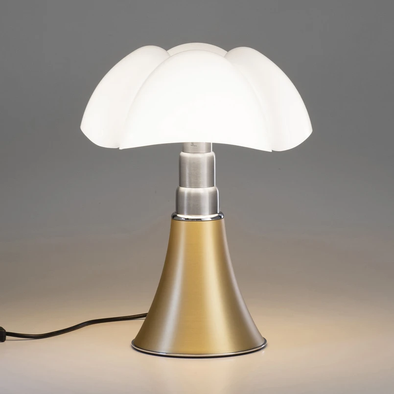 Lampa stołowa Minipistrello - po niemiecku "Fledermaus" - jest absolutnym obiektem sztuki, ponieważ jej czteroczęściowy opalno-biały klosz wykonany z metakrylanu rzeczywiście przypomina nieco rozłożone skrzydła nietoperza. Jej teleskopowa podstawa, wykonana z wysokiej jakości stali nierdzewnej, sprawia, że lampa jest nieocenioną atrakcją w salonie. Światło jest rozproszone i pozbawione olśnień dzięki kloszowi opalowemu, tworząc przyjemną atmosferę świetlną.