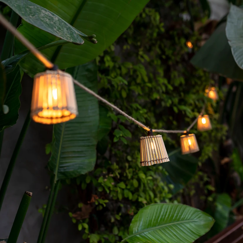 10-żarówkowe lampki wróżki Okinawa do użytku na zewnątrz 10-żarówkowych lampek wróżki Okinawa z bambusowymi kloszami to ładna dekoracja obszarów zewnętrznych, takich jak tarasy lub balkony. Łańcuch jest dostarczany z dziesięcioma żarówkami LED z trzonkiem E12 i dwiema zapasowymi żarówkami. Dzięki stopniowi ochrony IP44 (bryzgoszczelność) można go bezpiecznie używać na zewnątrz. Nadaje się również do użytku wewnątrz pomieszczeń. Można połączyć ze sobą do czterech łańcuchów świetlnych.