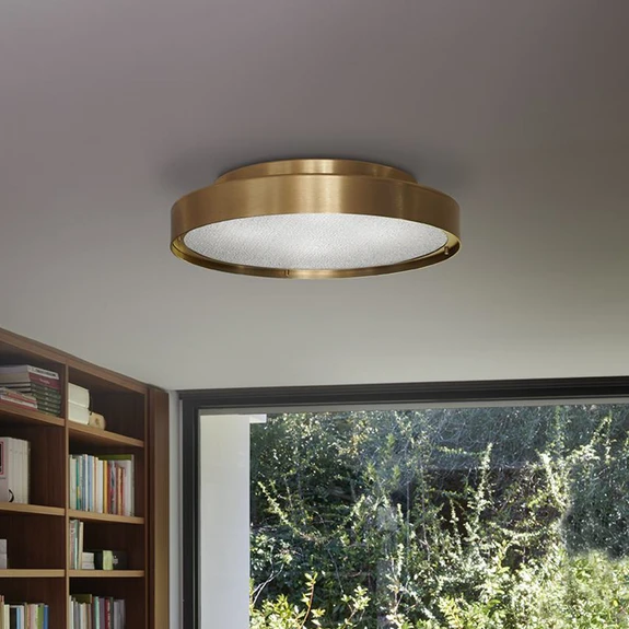Łączy w sobie okrągłe kształty z mieszanką materiałów, takich jak metal i piaskowane szkło. Okrągły pierścień wykonany z metalu ma satynowe wykończenie w kolorze mosiądzu i utrzymuje tarczę z siatki drucianej, przez którą prześwituje światło dwóch żarówek. W ten sposób powstaje bezpośrednie oświetlenie, które jest jednocześnie filtrowane przez szklany dyfuzor.