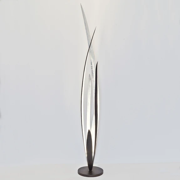 Lampa podłogowa Palustre w kolorze czarnym, brązowym i srebrnymLampa podłogowa Palustre ma bardzo naturalny design, który przypomina roślinę o wydłużonych liściach. Dzięki chłodnej kolorystyce wygląda wyjątkowo elegancko i można ją wkomponować w różne koncepcje pomieszczeń. Oprawa jest podświetlana od wewnętrznej strony podstawy. Światło jest odbijane w różnych kierunkach przez wydłużone, srebrne, żelazne liście, które rozciągają się w kierunku sufitu. Ze względu na kształt korpusu, lampa, która jest pokryta czarno-brązową powłoką na zewnątrz, tworzy dynamiczne i naturalne wrażenie.