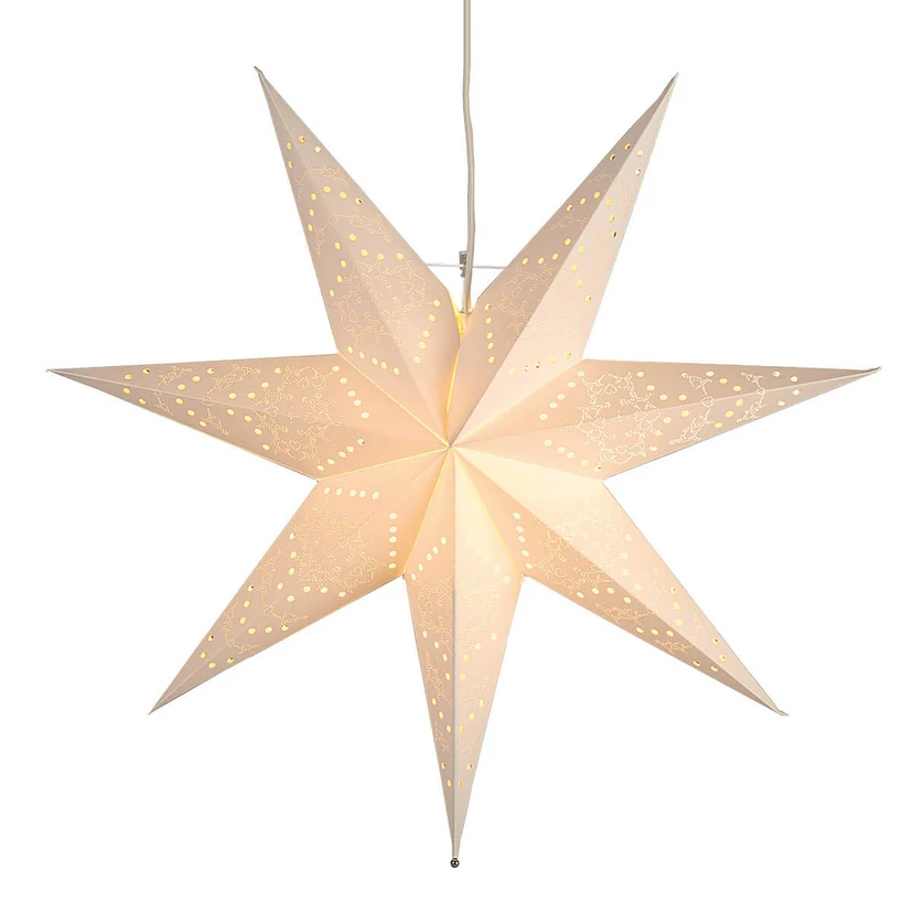Ta siedmioramienna gwiazda z cudnym wzorem ma średnicę 54 cm i stanowi zarówno świetną dekorację okienną, jak i nastrojową ozdobę pomieszczenia w czasie zimy i świąt Bożego Narodzenia. Z gwiazdą zintegrowana jest oprawa E14 wraz z przewodem zasilającym. Odpowiednią żarówkę można zamówić w dziale „Akcesoria dodatkowe”. Nie należy ona do zakresu dostawy.