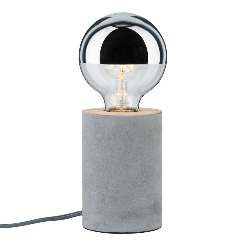 Ta lampa stołowa Mik, wykonana purystycznie w stylu skandynawskim, zachwyca tym, że została wykonana z betonu. Ta szara, cylindryczna podstawa podtrzymuje żarówkę E27 i szczególnie dobrze współpracuje z żarówkami kulistymi o lustrzanej powierzchni. Taka żarówka emituje światło, które nie oślepia i dostaje się do pomieszczenia w sposób pośredni. Lampa jest włączana i wyłączana za pomocą wyłącznika umieszczonego na kablu pokrytym tkaniną.