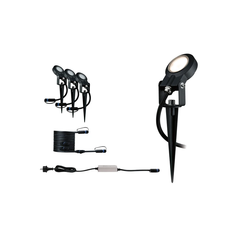Reflektor zewnętrzny LED Sting z grotem ziemnym Plug & Shine w podstawowym zestawie 3 sztuk Reflektor zewnętrzny LED Sting do montażu na grocie ziemnym jest wykończony w kolorze czarnym i ma płaską, okrągłą głowicę, którą można obracać o 120°. Ten praktyczny zestaw trzech reflektorów Plug & Shine może być używany do podkreślania roślin, fasad itp. lub do oświetlania ścieżek. Ponieważ w zestawie znajduje się również transformator z kablem wtykowym i kablem połączeniowym (wyjścia 200 cm, 350 cm, 500 cm i 515 cm), wszystkie elementy potrzebne do uruchomienia są natychmiast dostępne - dzięki napięciu roboczemu 24 V i zabezpieczonym przed wodą kablom, połączeniom i lampom, Plug & Shine firmy Paulmann jest wszechstronnym i bezpiecznym rozwiązaniem oświetleniowym do obszarów zewnętrznych.