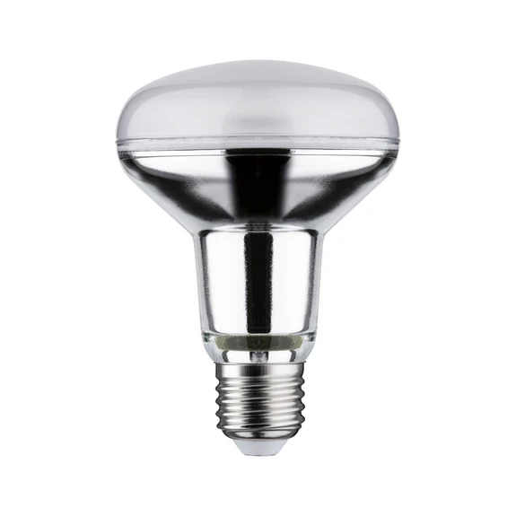 E27 6,5W reflektor LED R80 firmy Paulmann ze srebrną szklaną obudową, ciepły białyTa nieściemnialna lampa reflektorowa LED R80 z podstawą E27 emituje ciepłe białe światło o kącie wiązki 36°. Lampa jest szczególnie odpowiednia do spotów i reflektorów.