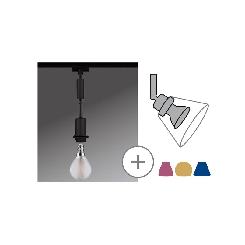 Zawieszka URail DecoSystems pozwala na zaprojektowanie oprawy wiszącej całkowicie według własnych życzeń. Sztywny korpus wykonany z metalu i tworzywa sztucznego jest utrzymany w matowej czerni i stanowi podstawę dla lampy wiszącej. Wisior jest wyposażony w gniazdo E14. Lampa jest ściemniana, ale ściemnianie zależy od doboru środka oświetleniowego.