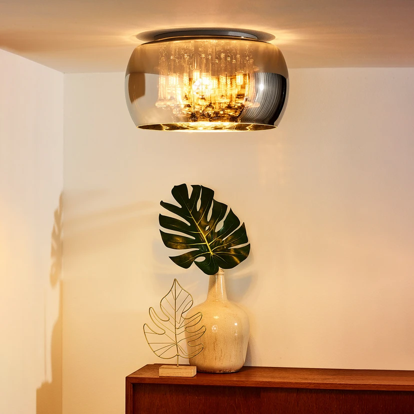 Pearl to lampa sufitowa, która przyciąga uwagę zarówno, gdy jest włączona, jak i wyłączona. Składa się z ręcznie dmuchanego klosza wykonanego ze szkła w kolorze dymu z opalizującym chromowanym wykończeniem i zawieszenia wykonanego z ciętego szkła kryształowego. Kryształowe elementy klosza mienią się i błyszczą w świetle, dodając ekskluzywnego charakteru każdemu pomieszczeniu. Dzięki połączeniu odbicia i przezroczystości, lampa sufitowa Pearl tworzy luksusowy i ciepły blask, który jest idealny do wnętrz w stylu rustykalnym lub nowoczesnym.