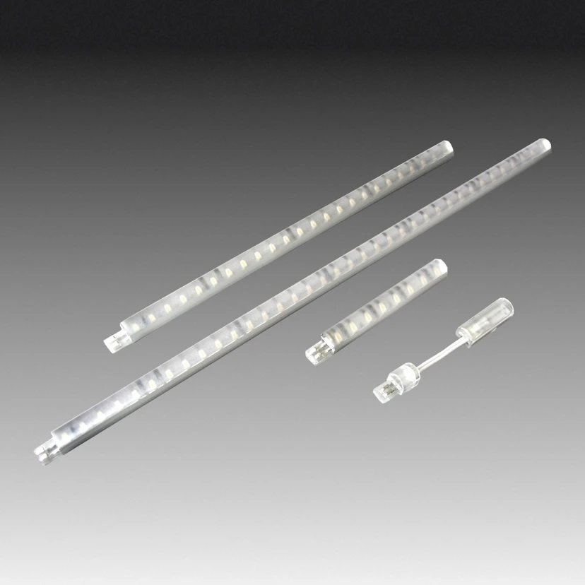 Światło bez ciepła: wtykany drążek LED do mebli Ten trwały drążek LED wykonany z białego tworzywa sztucznego nadaje się szczególnie do gablot, tablic i szafek. Diody LED mogą być używane przez około 30 000 godzin - bez generowania ciepła. Pałąk LED jest dostępny w różnych wersjach. Można je łączyć ze sobą, tworząc dłuższe paski świetlne (maks. 20 W lub 2,4 m). Kable połączeniowe, profile osłonowe, transformatory i różne kable połączeniowe można zamówić jako akcesoria.