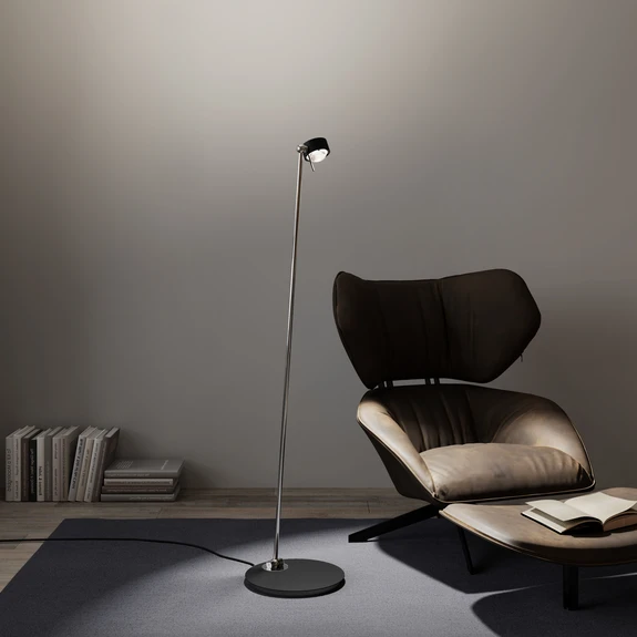 Elastycznie ustawiana lampa podłogowa LED Puk! 80 Floor z serii Avantgarde ze zintegrowanym ściemniaczem dotykowymTa smukła lampa podłogowa o nowoczesnym designie jest wyposażona w dwa różne klosze. Z obu stron jest to soczewka z matowego szkła, a z drugiej przezroczysta. Dzięki temu powstają różne efekty świetlne, które nadają lampie Puk Floor indywidualny charakter.Przezroczysta soczewka zapewnia wyraźny, skupiony stożek światła, który oświetla w bardzo ukierunkowany sposób. Z kolei matowe szkło tworzy bardzo miękkie, szeroko rozproszone światło o rozproszonym promieniowaniu.Za pomocą ściemniacza dotykowego, który jest przymocowany do ramy, ciepłobiałe diody LED można przyciemnić w zależności od potrzeb i w ten sposób zapewnić odpowiednią jasność w każdym momencie. Ponadto ma ona zarówno obracaną ramę, jak i obracaną głowicę, co nadaje jej elastyczność.- Obracana o 360° głowica oprawy- dzięki nowej technologii sprężyn łatwy montaż i wymiana akcesoriów- bezodblaskowa dzięki nowej technologii pierścieni i odbłyśników- wyjątkowo niepodatne powierzchnie dzięki nowym kolorom PVD- Made in Germany