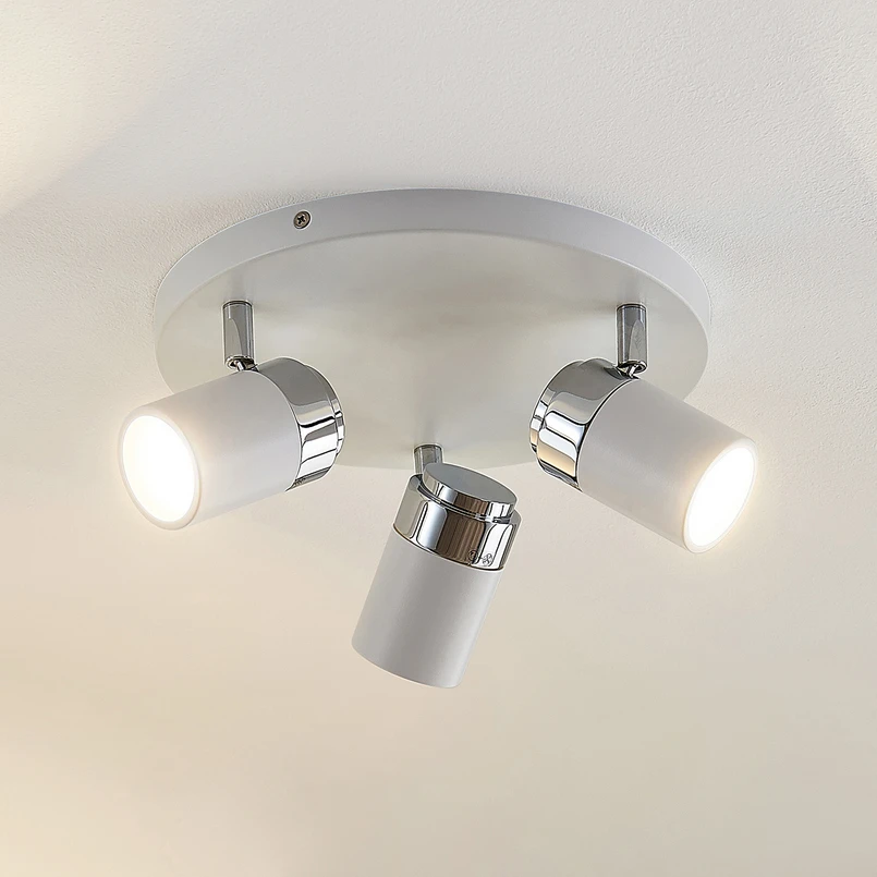 3-punktowa lampa sufitowa Kardo z białym wykończeniem - idealna do łazienki dzięki IP44 Kardo ma nowoczesny wygląd, ale także ponadczasowe cechy. Do okrągłego, również wykonanego z metalu mocowania sufitowego przymocowane są trzy ruchome klosze, które są połączone z płytą sufitową za pomocą przegubów, dzięki czemu można je dowolnie przesuwać. Dzięki oprawom GU10 można zastosować wybrane przez siebie żarówki, w tym popularne i energooszczędne żarówki LED. Lampa sufitowa jest dobrze zabezpieczona i posiada oznaczenie IP44, dzięki czemu jest wysoce zalecana do użytku w łazience.