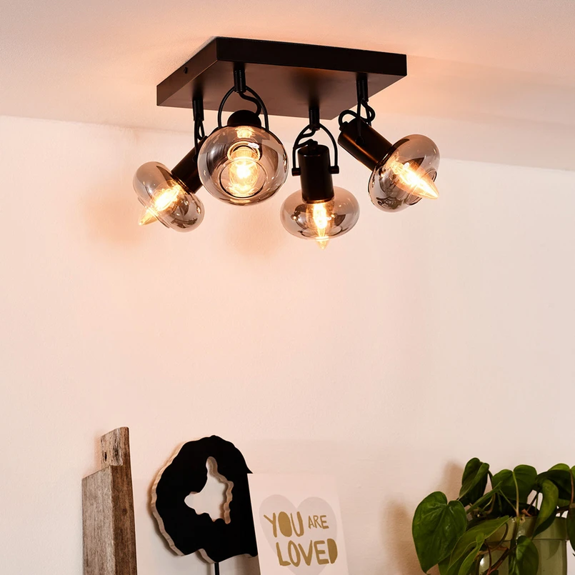 4-punktowe reflektory sufitowe lampy sufitowej Madee są przymocowane do kwadratowego mocowania sufitowego. W każdym z czterech rogów zamontowany jest jeden reflektor, który zawieszony jest na uchwycie umożliwiającym jego obracanie i odchylanie o 360°. Stosunkowo bliski montaż reflektorów oraz fakt, że wszystkie wyposażone są w szklany klosz w kolorze przydymionej szarości sprawiają, że światło wydaje się bardzo skupione i jasne. Rozproszone światło otula pomieszczenie przyjemną atmosferą. Światło wpadające przez otwór w każdym szklanym kloszu można wykorzystać do bezpośredniego oświetlenia pożądanych przedmiotów lub powierzchni. Jeśli lampa sufitowa jest podłączona za pomocą zewnętrznego ściemnianego regulatora, natężenie światła można indywidualnie dostosować do sytuacji.