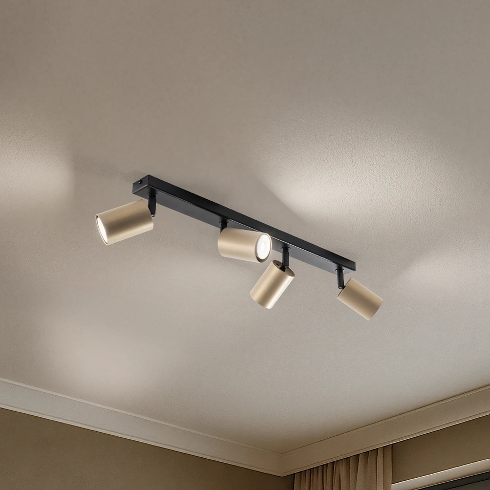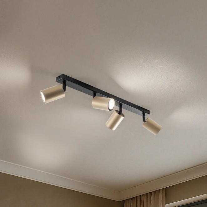 Reflektor sufitowy Zoom, 4-punktowy, w stylowej kombinacji kolorystycznej czarno-złotej, łączy w sobie nowoczesny design z funkcjonalnym oświetleniem. Wykonany z wysokiej jakości stali, reflektor ten stanowi trwałe i solidne rozwiązanie do różnych pomieszczeń mieszkalnych, takich jak salon, przedpokój, kuchnia i jadalnia. Możliwość ściemniania za pomocą zewnętrznego ściemniacza pozwala na elastyczne dostosowanie intensywności światła w celu stworzenia różnych nastrojów i optymalnego oświetlenia pomieszczenia.