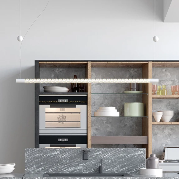 Lampa wisząca Squiggle zwisa na wdzięcznych, ledwo widocznych linkach i wydaje się niemalże unosić w pomieszczeniu. Wąska rurka tworzy klosz, który jest wykonany w całości z aluminium, a w jego wnętrzu znajdują się ciepłobiałe diody LED. Tuba zwisa poziomo i obejmuje dużą powierzchnię, którą jest w stanie oświetlić dzięki swojemu specjalnemu strumieniowi świetlnemu. W całej obudowie znajdują się liczne małe sześciokąty, które są wykrawane w kloszu i tworzą atrakcyjny, indywidualny wzór. Przez te otwory światło wydobywa się dookoła i wyczarowuje nastrojowe efekty świetlne.