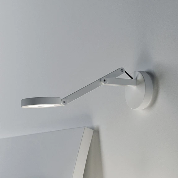 Wyposażony w istotne cechy serii String, kinkiet LED String inspiruje we wnętrzach mieszkalnych i hotelowych, ale także szczególnie jako lampa ścienna w sypialni. Szczególnie technologia dim-to-warm nadaje pomieszczeniu przytulną atmosferę. Na głowicy oprawy w kształcie pierścienia zamontowany jest ściemniacz dotykowy, który pełni jednocześnie funkcję włącznika oświetlenia. Dwa profile aluminiowe, połączone zawiasem, odsłaniają przewód tekstylny w swojej nakładce. Dzięki cięgnowi linowemu String można przechylać w dół z pozycji raczej poziomej i jest on zawsze stabilny w swojej pozycji.