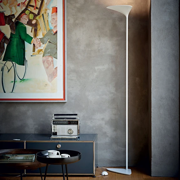 Lampa stojąca LED Sunset - pośrednie oświetlenie w czystej formie i kolorze Modnie zaprojektowana lampa stojąca LED Sunset zachwyca czystym wyglądem i nastrojowym oświetleniem. Wykonana jest z aluminium i w całości w kolorze matowej bieli, dzięki czemu stanowi harmonijny i dyskretny dodatek do nowoczesnych przestrzeni mieszkalnych. Zakrzywiony klosz jest główną atrakcją tej lampy podłogowej i zalewa ściany miękkim, ciepłym białym światłem. Pośrednia emisja światła tworzy przyjemną atmosferę i rozproszone oświetlenie pomieszczenia, które nadaje akcentów. Praktyczny ściemniacz nożny, który jest zintegrowany na kablu, ułatwia regulację jasności światła i dostosowanie go do sytuacji w zależności od potrzeb. Dzięki wysokiemu indeksowi barw, Sunset zapewnia wyjątkowo naturalne światło i bogate kolory. Projektantem tej oprawy jest Paolo Dell'Elce, który stworzył ją dla włoskiej firmy oświetleniowej Rotaliana. Jest specjalistą ds. produktów meblowych i oświetleniowych, a od 2015 r. kieruje zespołem projektantów mebli w Mediolanie. Jego prace były publikowane na całym świecie i otrzymały nagrody i uznanie, w tym Red Dot Award.