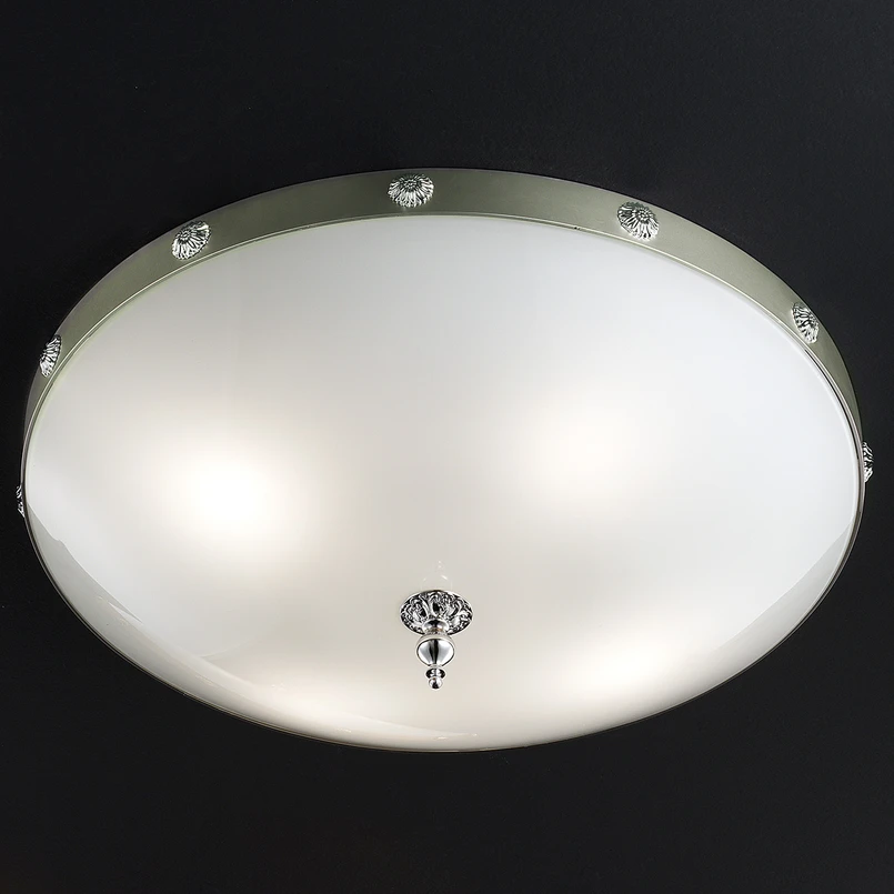 Zaprojektowane i wyprodukowane we Włoszech światło sufitowe Elegantia przekonuje dzięki zastosowaniu wysokiej jakości materiałów i eleganckiemu wyglądowi. Opalowy, biały odcień szkła obramowany jest matowym, chromowanym pierścieniem z drobnymi ornamentami i ozdobiony chromowanym, zdobionym guzikiem końcowym.