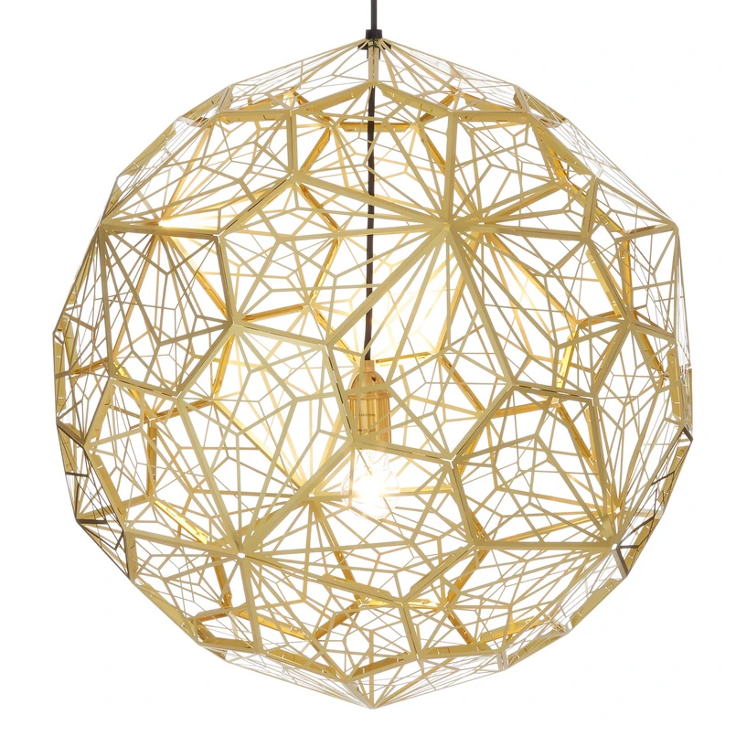 Lampa wisząca Etch Web o geometrycznym kształcie jest inspirującym i wyróżniającym się projektem. Wiele drobnych rozpórek i elementów wykonanych z mosiądzu tworzy liczne kanciaste przekroje, które w ogólnym rozrachunku dają prawie kulisty wielościan. Elementy z wytrawianymi powierzchniami tworzą poprzez liczne listwy i otwory niepowtarzalne efekty świetlne, które wyróżniają się w całym pomieszczeniu i inspirują grą światła i cienia. Otwarte przestrzenie pozwalają na wgląd do źródła światła znajdującego się wewnątrz. Dlatego, aby w pełni rozwinąć wyjątkowy urok Etch Web, zaleca się zastosowanie dekoracyjnej żarówki.