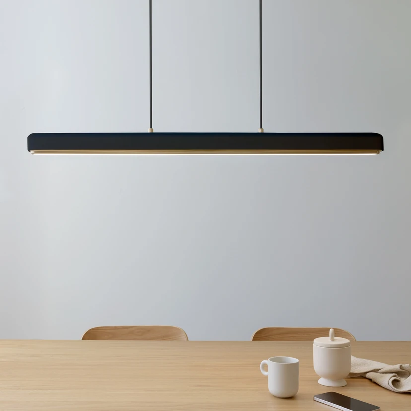 Lampa wisząca LED Hazel Branch z możliwością zmiany barwy światła (CCT) Lampa wisząca LED Hazel Branch duńskiej marki UMAGE ma funkcjonalny, a jednocześnie elegancki design. Oprawa z długim, wąskim kloszem jest wykonana z aluminium i wyposażona w dopasowany kolorystycznie przewód tekstylny. Dzięki swojej technologii i funkcjonalności w projektowaniu oświetlenia, oprawa nadaje się nie tylko do użytku nad stołem jadalnym lub blatem kuchennym w otoczeniu prywatnym, ale także do oświetlania sal konferencyjnych w sektorze komercyjnym. Oprawa wyposażona jest w panel LED za białym dyfuzorem, zapewniającym nieoślepiającą, miękką wiązkę światła. Dwa przyciski na górze klosza umożliwiają regulację temperatury światła i natężenia światła: barwę światła można ustawić na czterech poziomach (ciepła biel 2700 K, ciepła biel 3000 K, uniwersalna biel 4000 K i światło dzienne 6000 K), a światło można ściemniać na czterech poziomach (poziom 1 300 lm, poziom 2 550 lm, poziom 3 900 lm, poziom 4 1150 lm). Należy również podkreślić szczególnie dobre oddawanie barw światła o indeksie Ra93.