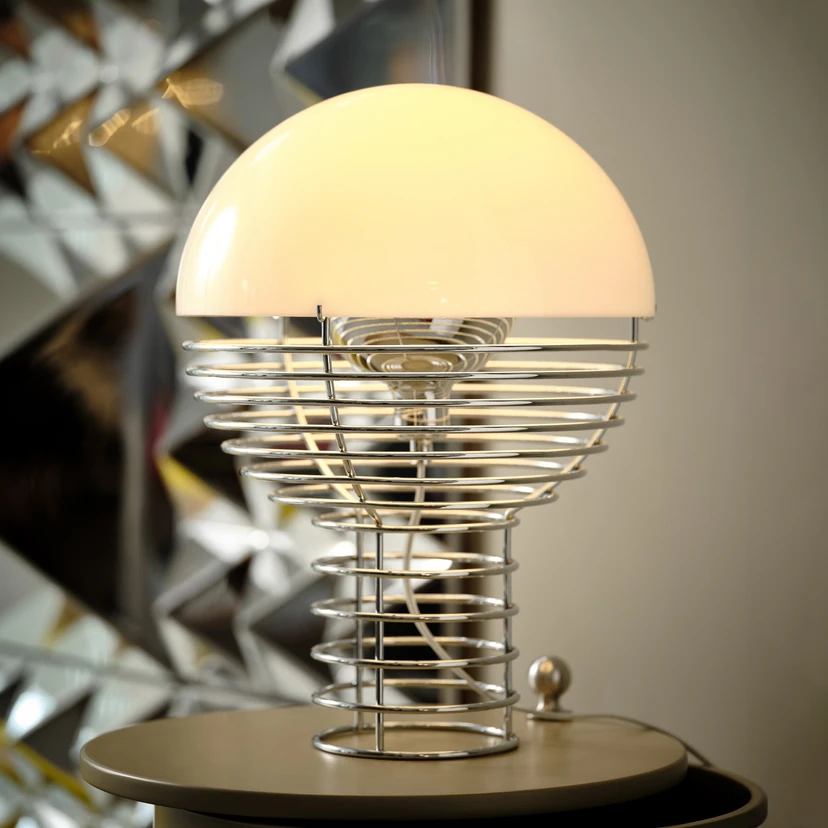 The Wire Lamp - świetlisty dodatek Vernera Pantona do serii mebli Pantonova Mała lampa stołowa The Wire od VERPAN zachwyca niezwykłą zasadą projektowania. Podstawa lampy uformowana z chromowanego metalowego drutu, precyzyjnie wykonana bez szwów spawalniczych, łączy się z plastikową półkulą, która osłania źródło światła. Źródło światła znajduje się pośrodku chromowanego metalowego odbłyśnika, który kieruje światło w stronę półkuli. Lampa Wire ujawnia przezroczystość swojego klosza dopiero po włączeniu światła. Tworzy to cudownie nieoślepiające, miękkie światło, które nadaje otoczeniu wysoki stopień przytulności. Plastikowa półkula jest zdejmowana, dzięki czemu źródło światła można łatwo włożyć i wymienić. VERNE Panton był doskonałym projektantem mebli. Wraz z serią Pantonova, którą zaprojektował i wyprodukował w 1971 roku dla restauracji Varna w Århus w Danii, stworzył serię awangardowych mebli, z których wszystkie składały się z równoległych prętów drucianych i otwartych sekcji bocznych. Dive to meble do siedzenia z serii Pantonova, uzupełnione o systemy regałów, stoły i różne akcesoria, które można dowolnie ze sobą łączyć. Pantonova wyraża koncepcję projektową Vernera Pantona, zgodnie z którą nigdy nie należy patrzeć tylko na pojedynczy obiekt, ale raczej na całe pomieszczenie. Rok później, w 1972 roku, lampa Wire stała się idealnym uzupełnieniem serii mebli Pantonova. Design lampy stołowej odzwierciedla konstrukcję mebli i dopełnia koncepcję tej serii jako przytulnego źródła światła.