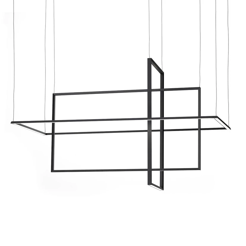 Geometryczna lampa wisząca LED Area w całości w kolorze czarnymLampa wisząca LED Area w całości w kolorze czarnym charakteryzuje się czystą prostotą i elegancją. Przejrzysty i nowoczesny design jest koniecznością dla wszystkich miłośników minimalistycznego, nowoczesnego stylu życia. Lampa składa się z trzech prostokątnych kształtów, które zwisają ze sobą bez dotykania się. Udało się to dzięki sprytnemu zawieszeniu, ponieważ każdy element jest połączony cienkimi kablami z podstawą. Oświetlenie jest tu realizowane za pomocą nowoczesnych taśm LED, które są przymocowane do spodu poszczególnych kształtów, a w jednym elemencie również do góry. Po włączeniu, ciepłe białe światło jest rozprowadzane w pomieszczeniu, co jest szczególnie skuteczne nad stołem i zapewnia przyjemne warunki oświetleniowe.