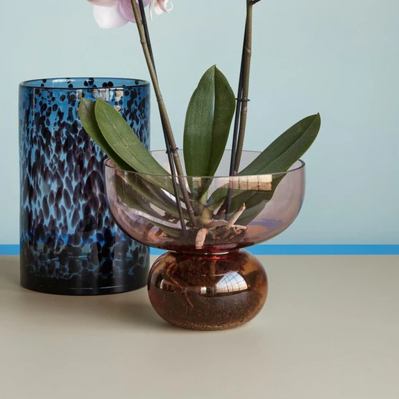 Szklany wazon Bellied Show Wazon jest wykonany ze szkła i jest dostępny w kombinacji kolorów różowego i bursztynowego. Połączenie tych dwóch kolorów tworzy jasny i zabawny wygląd. Unikalny kształt wazonu sprawia, że jest on nowoczesnym i stylowym detalem wystroju wnętrza. Ten produkt jest wykonany ręcznie i może się różnić.