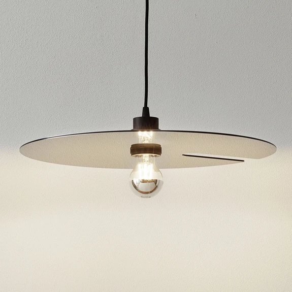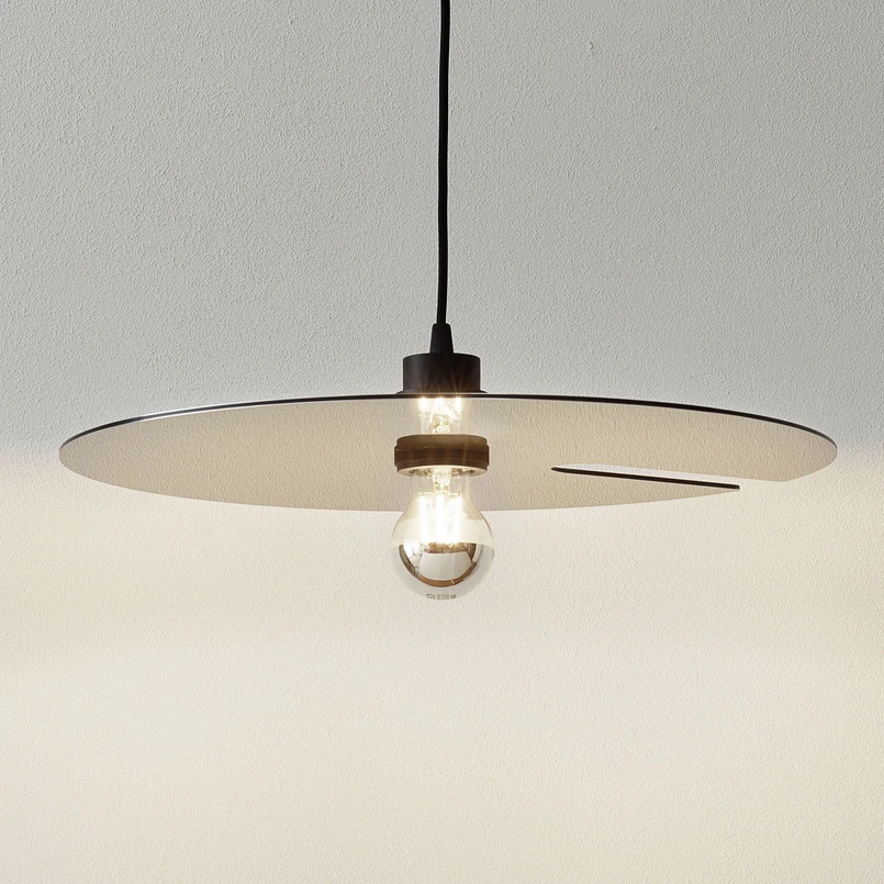 Fascynująca lampa wisząca Mirro 2.0 - czarna/chromowa Lampa wisząca Mirro, której metalowy klosz w kształcie dysku jest pomalowany na czarno (górna strona) i błyszcząco chromowany (spód), gwarantuje szczególnie błyskotliwą emisję światła o splocie Spiegel. Oznacza to, że w kloszu odbija się światło zarówno użytej lampy, jak i przedmiotów znajdujących się pod lampą - na przykład na stole. Metalowa tarcza jest z jednej strony ścięta, dzięki czemu część światła może również wydostawać się w kierunku Decku. Wysokość zawieszenia można określić dopiero po zamontowaniu oprawy (maks. 250 cm).