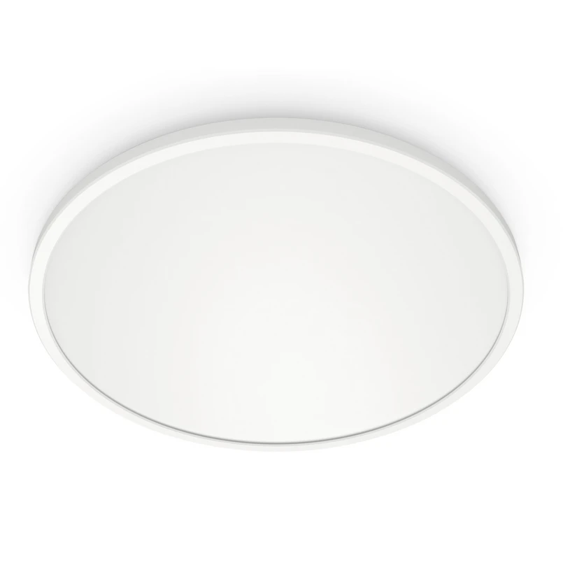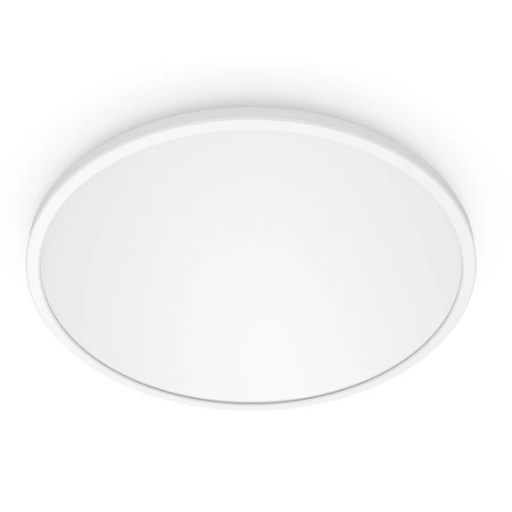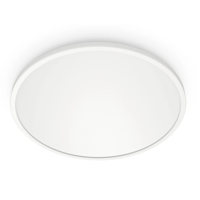 Inteligentna lampa sufitowa LED SuperSlim o niewielkiej wysokości montażu Jak sama nazwa wskazuje, inteligentna lampa sufitowa LED SuperSlim to niezwykle płaska oprawa natynkowa LED, która idealnie nadaje się do stosowania w pomieszczeniach o niewielkiej wysokości sufitu. Ma okrągły kształt i jest zamknięta w dolnej części satynowanym dyfuzorem, dzięki czemu światło jest kierowane do pomieszczenia bez oślepiania. Wbudowana technologia oświetlenia WiZ, którą można sterować za pomocą smartfona, przełącznika ściennego WiZ lub pilota zdalnego sterowania WiZ (patrz akcesoria), może być używana do tworzenia żywych rytmów oświetlenia, które naśladują naturalny przebieg dnia, a tym samym zwiększają osobiste samopoczucie.
