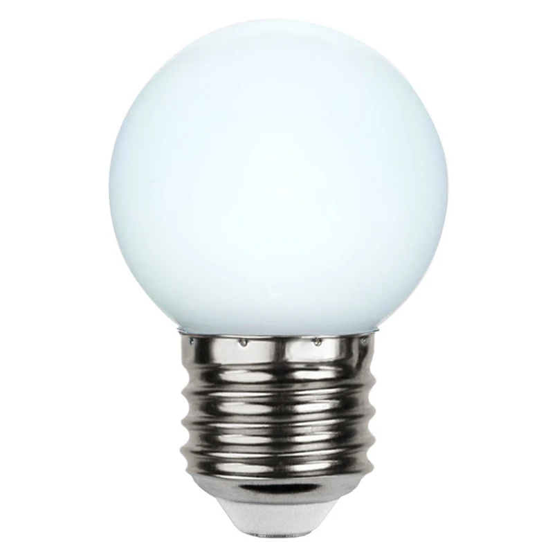 Biała mini żarówka LED E27 G45 do lampek choinkowych, odporna na stłuczenia Oprócz kolorowych żarówek w łańcuchach świetlnych, białe żarówki również wyglądają bardzo atrakcyjnie, jeśli oświetlenie nie powinno być zbyt dominujące. Ta biała mini żarówka, wykonana z nietłukącego się poliwęglanu, może być wkręcana w łańcuchy świetlne z oprawami E27 i jest odporna na uderzenia bez ryzyka pęknięcia. Cechy: - Może być używana w temperaturach od -20 do +40 °C - Wykonana z nietłukącego się poliwęglanu