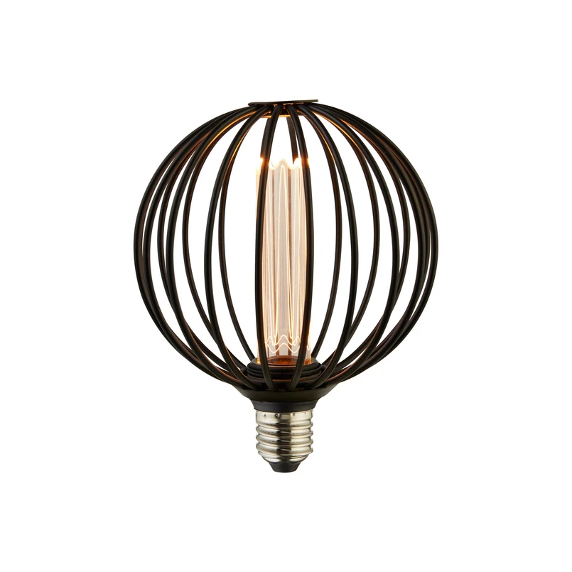 Źródło światła LED Globe Filament z oprawą E27, 3,5 W, 1800 kelwinów, ściemniane Źródło światła LED Globe do opraw E27 ma kulistą, lakierowaną na czarno stalową klatkę. Żarniki wewnątrz są otoczone szkłem. Globe emituje ciepłe, białe światło i może być ściemniana zewnętrznie.