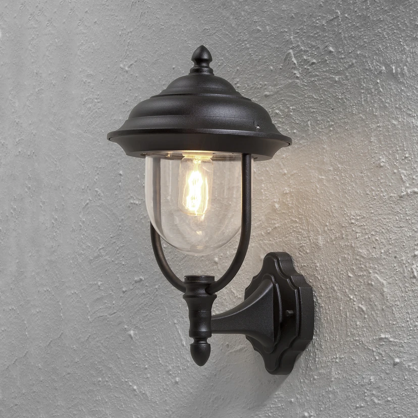 Klasyczna wykonana z aluminium stojąca zewnętrzna lampa ścienna PARMA, do wyboru w kolorze białym, zielonym lub czarnym lakierowanym matowym. Przezroczysty klosz tej lampy gwarantuje optymalne oświetlenie. Klosz o pięknym kształcie oraz zdobienia nadają tej lampie lekko nostalgiczny charakter.